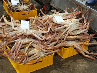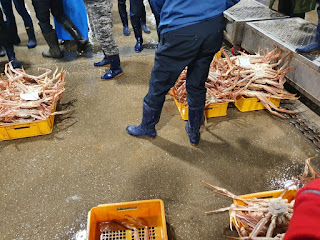 안에는 대게, 대게가 얼음에 쌓여있었어요~ 아직 살아있으니까 발이 움직여요!도제님은 3번의 경매에 참여해서 B급, 소금에 절인 대게, 대게, 이렇게 나눠서 샀어~ A급은 도매하는 분들이 거의 다 팔아 저희는 바로 먹기 때문에 필요 없어요.