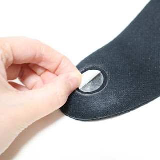 그럼 본격적으로 붙여볼까?뒷면에 있는 양면 테이프를 찢어서 신발 뒤꿈치에 맞게 붙이기만 하면 됨!
